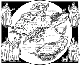 Ithania is the whole continent in which The Age of Five Trilogy takes place in. It is split into Northern Ithania, ruled by the White with the Circlian faith, and Southern Ithania, ruled by the Voices with the Pentadrian faith.
