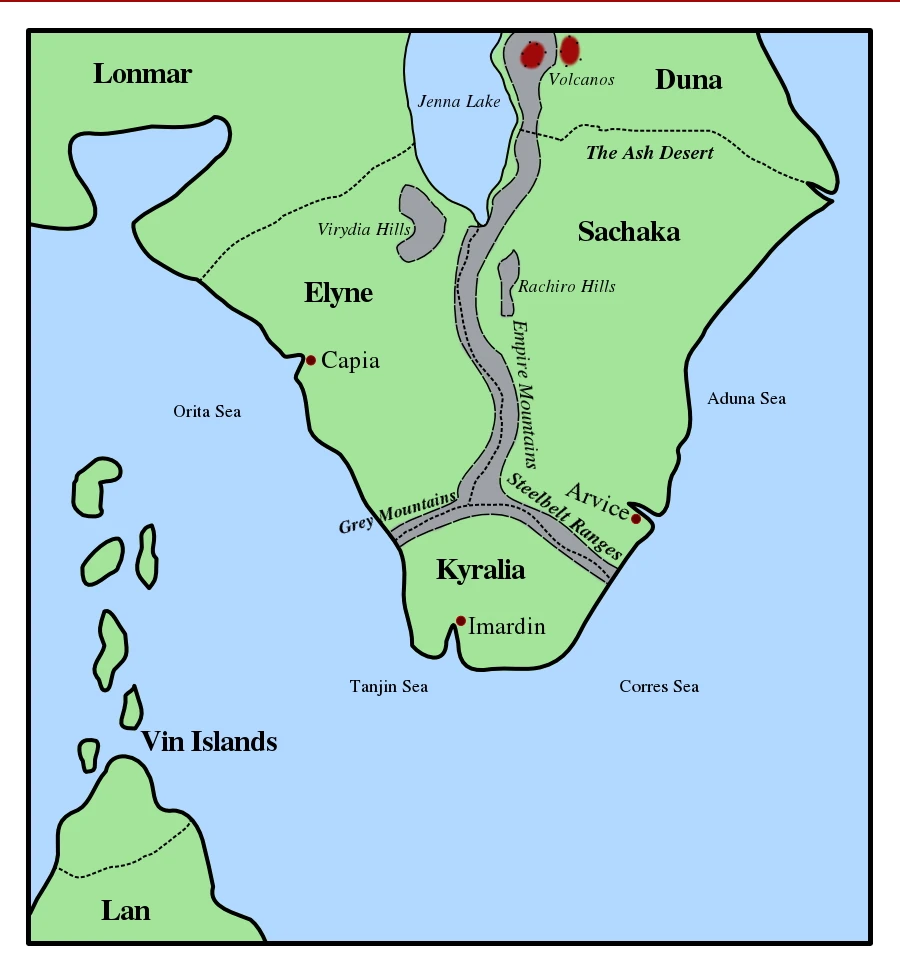 Lan lies to the south of Kyralia (which is separated by the sea), and to its north are the Vin Islands. The land is mountainous and as large high plains inland. The capital of Lan is Tol-Gan.